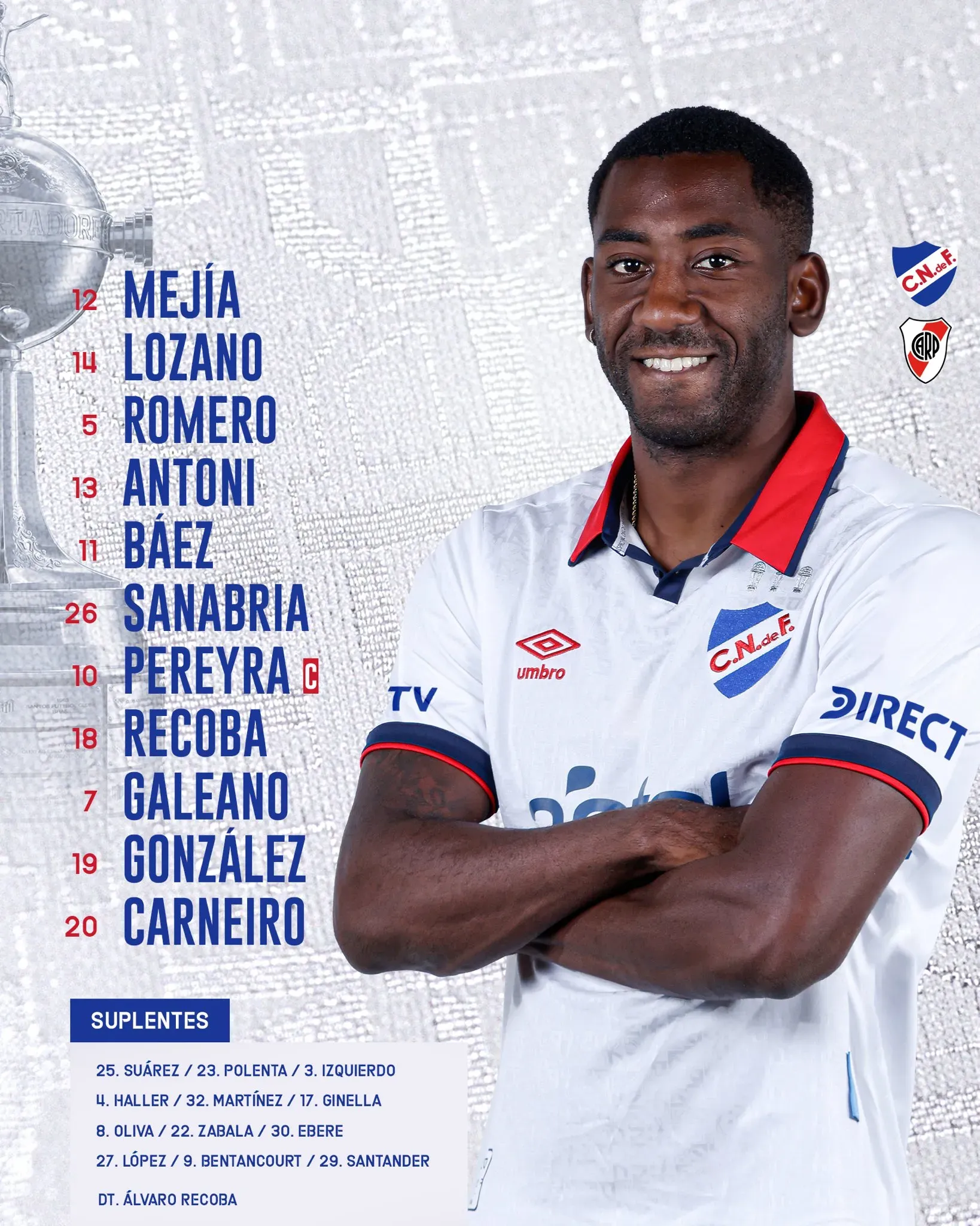 Franco Armani; Andrés Herrera, Leandro González Pirez, Paulo Díaz, Enzo Díaz; Ignacio Fernández, Rodrigo Villagra, Rodrigo Aliendro; Claudio Echeverri; Facundo Colidio y Miguel Borja, los once elegidos por Demichelis para enfrentar a Nacional.
