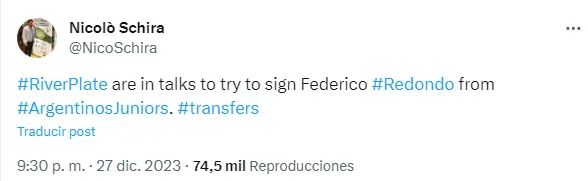Según informó el periodista italiano especialista en mercados de pases Nicolo Schira, River ya mantendría contactos con Argentinos Juniors para quedarse con el pase de Federico Redondo y reemplazar así a Enzo Pérez con el talento argentino.