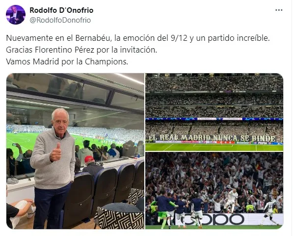 “Nuevamente en el Bernabéu, la emoción del 9/12 y un partido increíble. Gracias Florentino Pérez por la invitación. Vamos Madrid por la Champions“, publicó Rodolfo D’Onofrio en sus cuentas de Instagram y X (ex Twitter). El posteo del expresidente del Millo sirvió para revivir las gastadas y el goce de los hinchas del Más Grande sobre el eterno rival.
