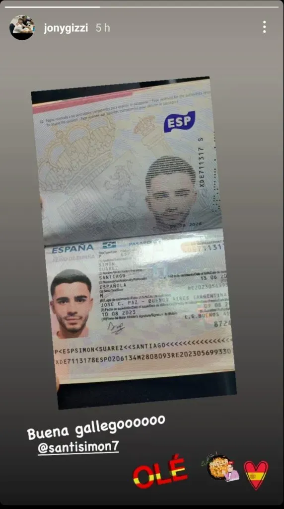 En las últimas horas Santiago Simón volvió a ser noticia, esta vez por una noticia que involucra a su futuro. Su representante, Jonathan Gizzi, compartió una imagen en Instagram y una frase muy sugestiva: “Buena gallegooo”, posteó su agente junto a una foto del pasaporte del futbolista millonario.