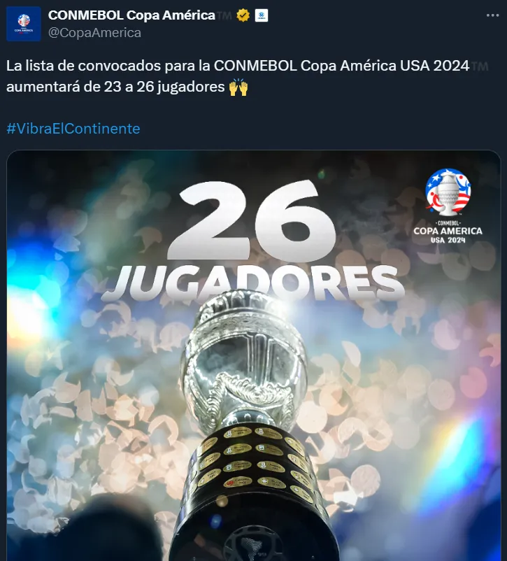 En las últimas horas, CONMEBOL y CONCACAF llevaron a cabo la confirmación en torno a la aprobación de la ampliación de las listas de los diversos seleccionados participantes de la Copa América que se llevará a cabo este año en Estados Unidos. De esta manera, los combinados podrán tener 26 jugadores a disposición en vez de 23.