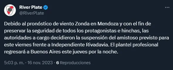 “Debido al pronóstico de viento Zonda en Mendoza y con el fin de preservar la seguridad de todos los protagonistas e hinchas, las autoridades a cargo decidieron la suspensión del amistoso previsto para este viernes frente a Independiente Rivadavia. El plantel profesional regresará a Buenos Aires este jueves por la noche“, explicó River en sus redes.