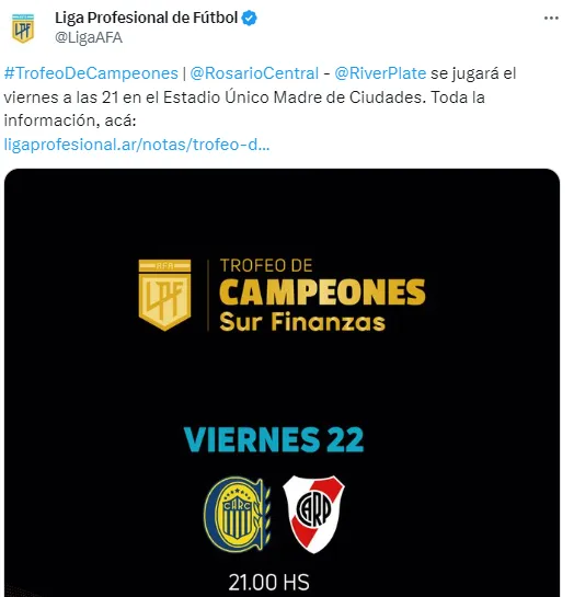 Informaciones que terminaron siendo descartadas en la tarde de este lunes ya que la AFA hizo oficial su decisión y confirmó que el estadio Madre de Ciudades será la sede de la final entre River y Rosario Central desde en la noche del próximo viernes 22 de diciembre desde las 21 horas.