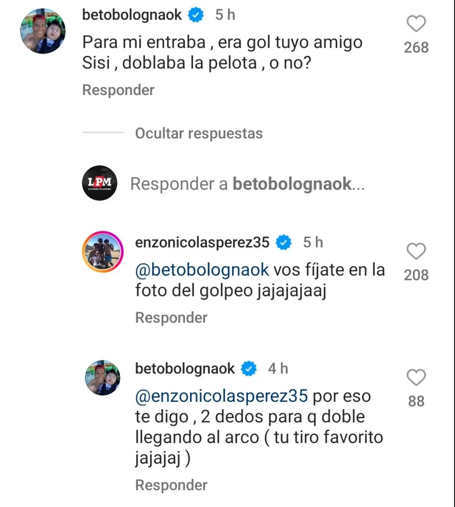 “Vos fijate en la foto del golpeo jajajajaja“, le contestó Enzo, subrayando su mérito en el 1-0 de River. “Por eso te digo, dos dedos para que doble llegando al arco (tu tiro favorito) jajajaja“, la remató Bologna, quien siempre se muestra muy cercano al Millonario pese a atajar en otro club.