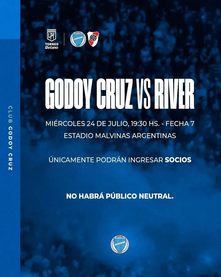 Luego de confirmar que finalmente habrá público en el estadio pese a que una sanción iba a impedir esto, desde Godoy Cruz confirmaron que solo podrán asistir al partido los socios del equipo mendocino. De esta manera, la gente de River no podrá asistir al Malvinas Argentinas.