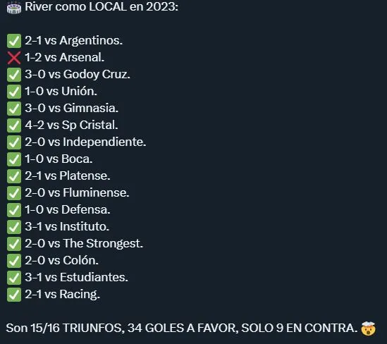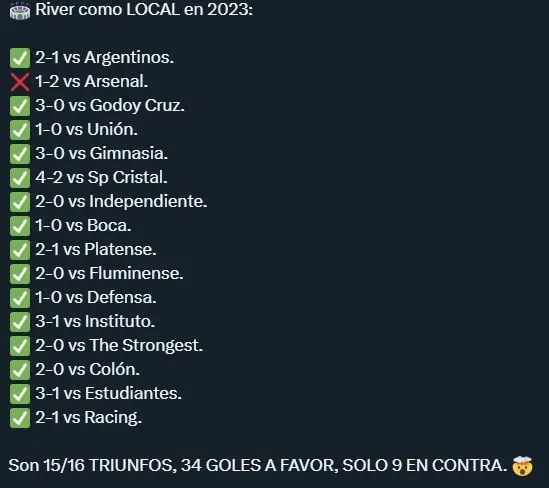 Con la victoria 2-0 ante la Academia, River llegó a ¡14 triunfos consecutivos! jugando en su cancha, algo que jamás hizo ningún equipo del fútbol argentino en toda la historia. El River de Marcelo Gallardo en 2014 había llegado a 13, mismo número que alcanzó Demichelis en el triunfo con Estudiantes que le dio el título. Y esta noche dio el paso adelante para quedar en los libros dorados.