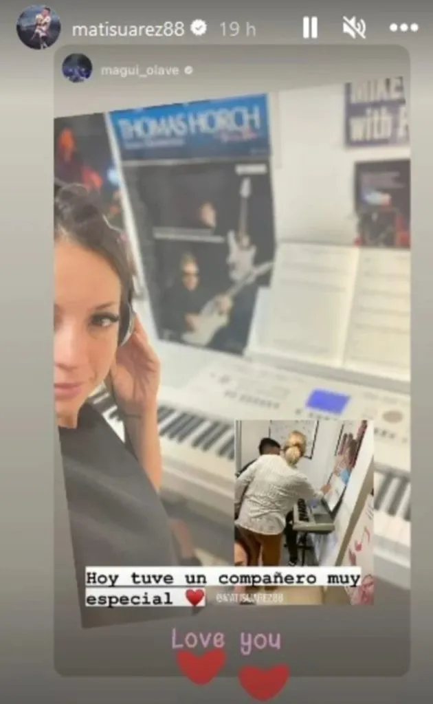 Magui Olave es cantante de cuarteto y lanzó un nuevo album titulado Adiós. Dará algunos shows durante los próximos días y en su cuenta de Instagram compartió una tierna foto de su marido tocando el piano. “Hoy tuve un compañero muy especial“, escribió. Suárez tiene cerca a la pelota pero también a los instrumentos por la profesión de su mujer.