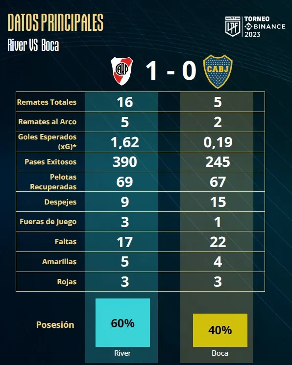 En todos los ámbitos de las estadísticas River fue ampliamente superior a Boca. En cuanto a la tenencia de la pelota, el equipo de Martín Demichelis la tuvo un 60% mientras que los de Almirón un 40%. En relación a los remates: River lo hizo en 16 oportunidades y cinco de esos tiros fueron al arco, Boca remató apenas en cinco oportunidades y dos de ellas fueron al arco. El Más Grande completó 390 pases exitosos y Boca 245. En las recuperaciones de pelota se equipara un poco la estadística: el Millonario 69 y el eterno rival 67.