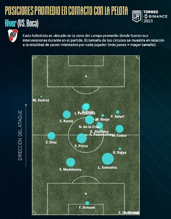 Más allá de lo que se observó claramente el pasado domingo en cuanto a la actitud de cada equipo, el lugar donde se paró en la cancha cada equipo es la clara muestra de lo que fue el partido. Salvo lo marcador centrales y Armani, River se paró en campo rival y sus futbolistas tuvieron contacto con la pelota por delante de la mitad de la cancha. En cambio, en Boca pasó todo lo contrario, salvo Villa, Merentiel y Vázquez -estuvieron al límite- el resto de los jugadores del equipo de Almirón tuvieron contracto con la pelota mayormente en su propio campo.