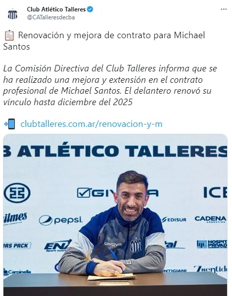 La dirigencia de Talleres tomó nota del interés de River, que está dispuesto a comprar el 80% de la ficha del delantero uruguayo, de acuerdo a las noticias que trascendieron en los últimos días. Por esta razón tomaron una primera determinación antes de sentarse a negociar con el Millonario: acordaron con Michael Santos una extensión de su contrato por una temporada más, hasta diciembre de 2025, incluyendo una mejora salarial en su nuevo vínculo.