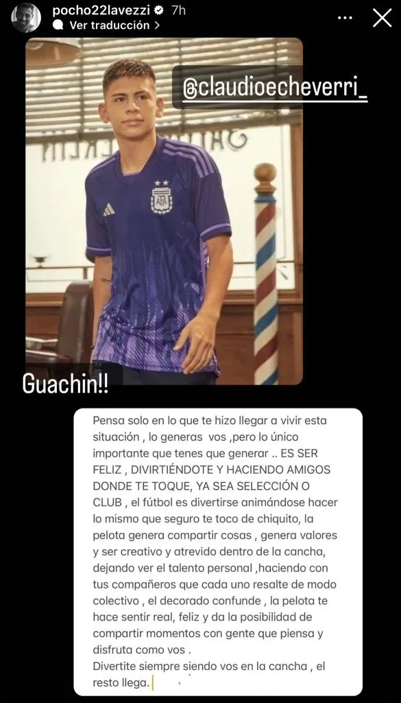 Lavezzi adjuntó una captura del mensaje que le dejó por privado al 10 de la Reserva: “Pensá sólo en lo que te hizo llegar a vivir esta situación. La generás vos, pero lo único importante que tenés que generar es ser feliz, divirtiéndote y haciendo amigos donde te toque, ya sea en la Selección o en el club“, inicia el escrito.