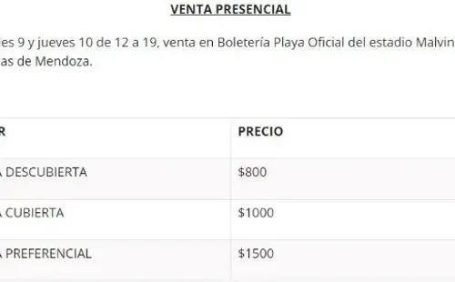 Además, en Mendoza habrá venta presencial: será el miércoles 9 y el jueves 10 de octubre, de 12 a 19 horas, en la Boletería Playa Oficial del estadio Malvinas Argentinas.