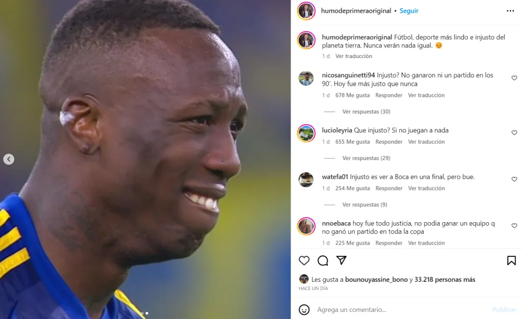 El pasado sábado, Boca cayó en la final de la Libertadores ante Fluminense y la cuenta de Instagram @humodeprimeraoriginal, que se dedica a hacer memes, compartió una foto de Advíncula celebrando el gol en la final y luego otra llorando desconsolado. A esa publicación, Bono le dio like y varios hinchas de River enloquecieron. Gastar al rival -sin violencia- es parte del fútbol y está bien que así sea.