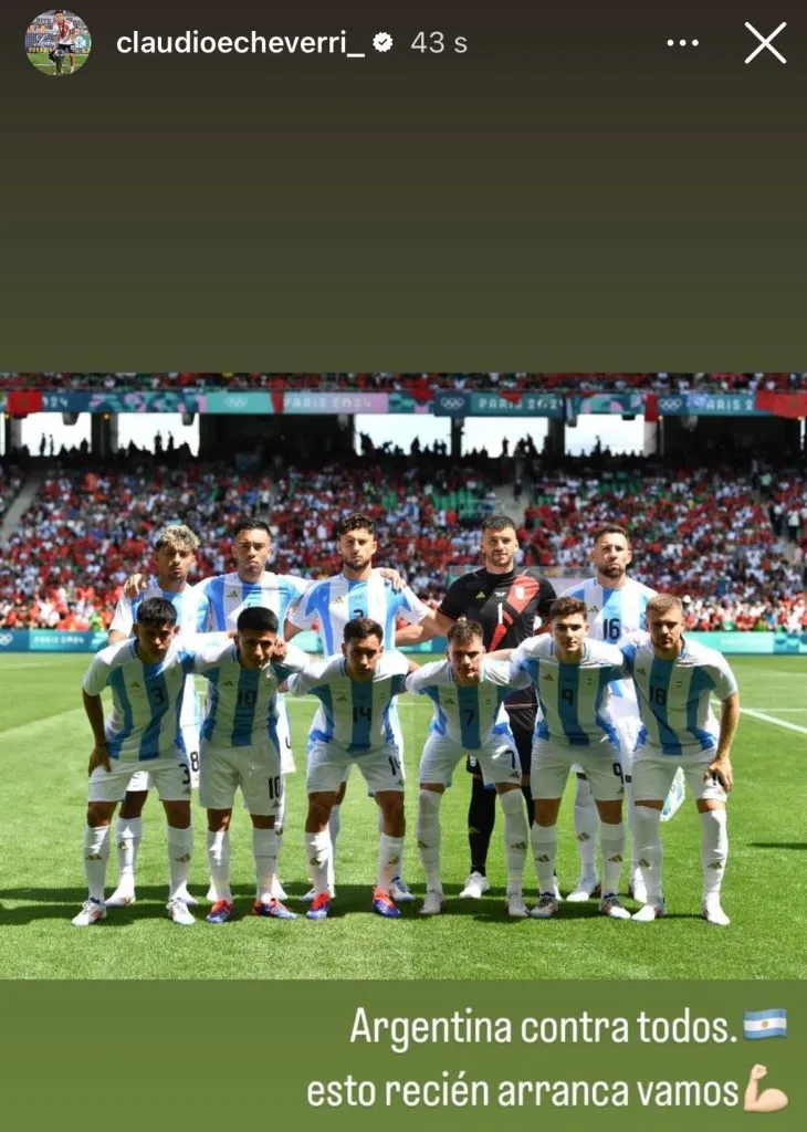 En un debut que pasará a la historia del fútbol por la insólita decisión del Comité Olímpico Internacional de reanudar el partido tras casi dos horas desde su suspensión, Claudio Echeverri salió con los tapones de punta en su perfil de Instagram y apuntó a la recuperación del equipo.