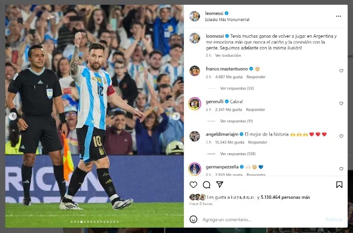 Ese posteo superó los 5 millones de likes y acumula hasta ahora más de 80 mil comentarios entre los cuales aparece uno de Franco Mastantuono (en el radar del Milan de Italia), que fue una reacción con un emoji de cabeza explotada dando a entender la locura que generó la noche de Messi en el Monumental.
