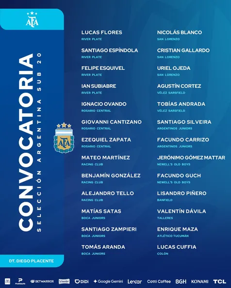 La fecha FIFA no será solo para el seleccionado mayor, sino que la Selección Argentina Sub-20 también tendrá actividad. Después de perder la Copa del Mundo 2025 en la final, el equipo dirigido por Diego Placente se armará en vistas a las próximas competiciones. En la reestructuración, el DT citó a cuatro jugadores de River.