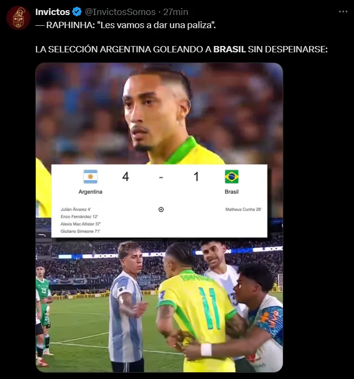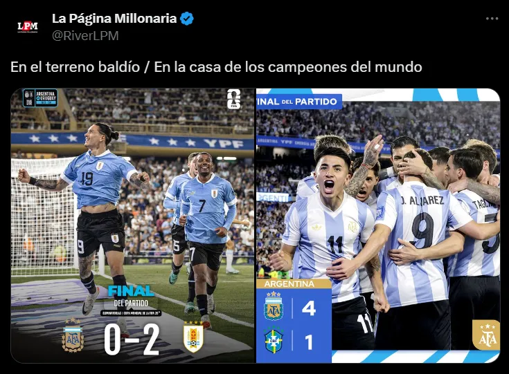 La Selección Argentina celebró de la mejor manera la buena noticia que recibió antes de comenzar el partido: ya había obtenido su pasaje para la próxima Copa del Mundo. Luego debía jugar contra Brasil en el Estadio Monumental y fue un verdadero baile: goleada por 4-1. Los goles tuvieron un sello del Millonario: Julián Álvarez, Enzo Fernández y Giuliano Simeone.