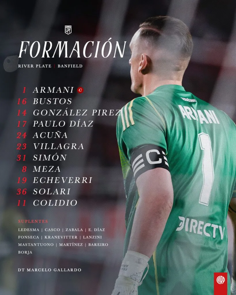 Franco Armani; Fabricio Bustos, Leandro González Pirez, Paulo Díaz, Marcos Acuña; Rodrigo Villagra, Santiago Simón; Maxi Meza, Claudio Echeverri; Facundo Colidio y Pablo Solari, el equipo elegido por Marcelo Gallardo para jugar frente al Taladro.