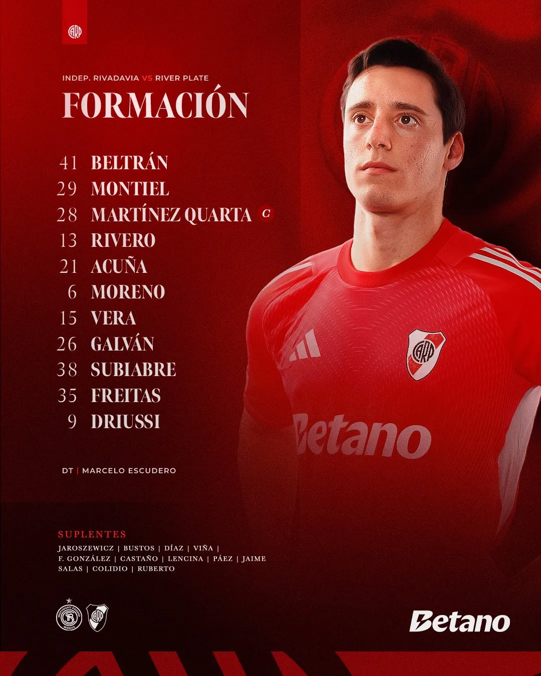 Los once que pone en cancha Escudero en Mendoza esta noche: Santiago Beltrán; Gonzalo Montiel, Lucas Martínez Quarta, Lautaro Rivero, Marcos Acuña; Fausto Vera, Aníbal Moreno; Ian Subiabre, Joaquín Freitas, Tomás Galván; Sebastián Driussi.