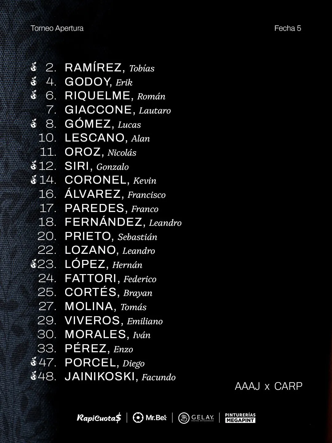 El DT Nicolás Diez también presentó su alineación: Brayan Cortés; Leandro Lozano, Francisco Álvarez, Erik Godoy, Kevin Coronel; Nicolás Oroz, Federico Fattori, Alan Lescano, Emiliano Viveros; Hernán López Muñoz y Tomás Molina.