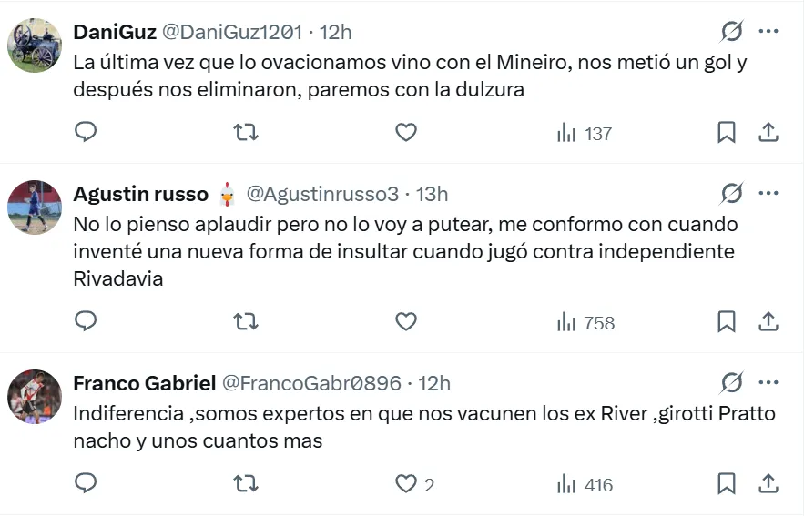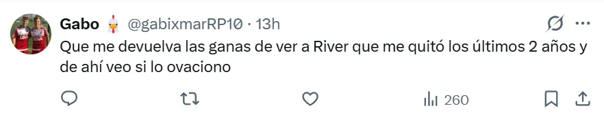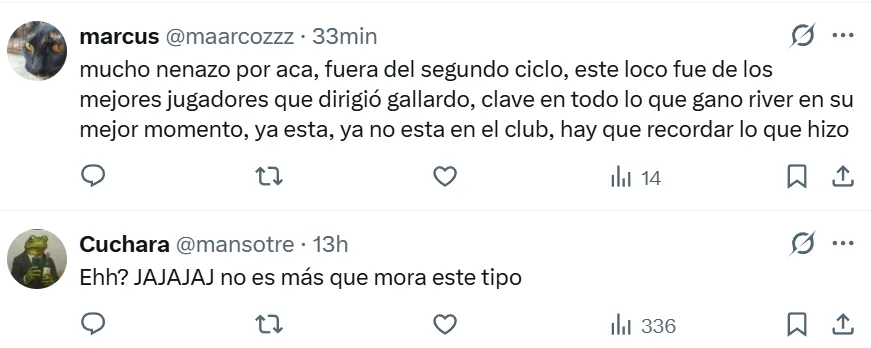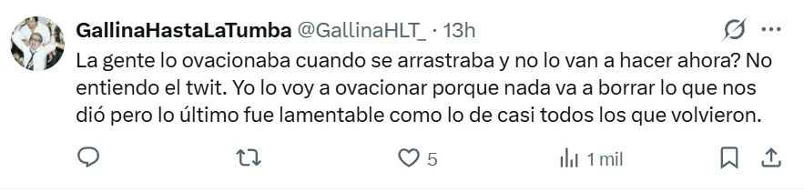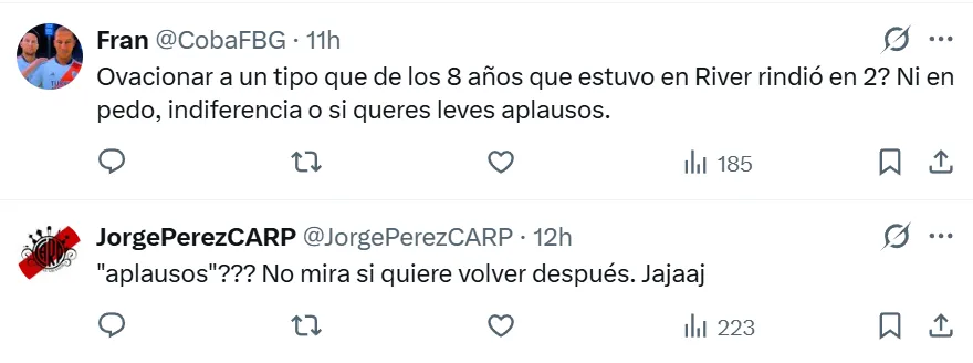 Las opiniones difieren entre quienes aseguran que hay mostrar cariño y gratitud con uno de los jugadores emblemáticos del primer ciclo de Gallardo, campeón de Copa Libertadores. Otros hacen hincapié en que la segunda etapa del volante en el Millonario fue muy mala y que se extendió más de lo debido, y por eso no debe ser reconocido por la gente.