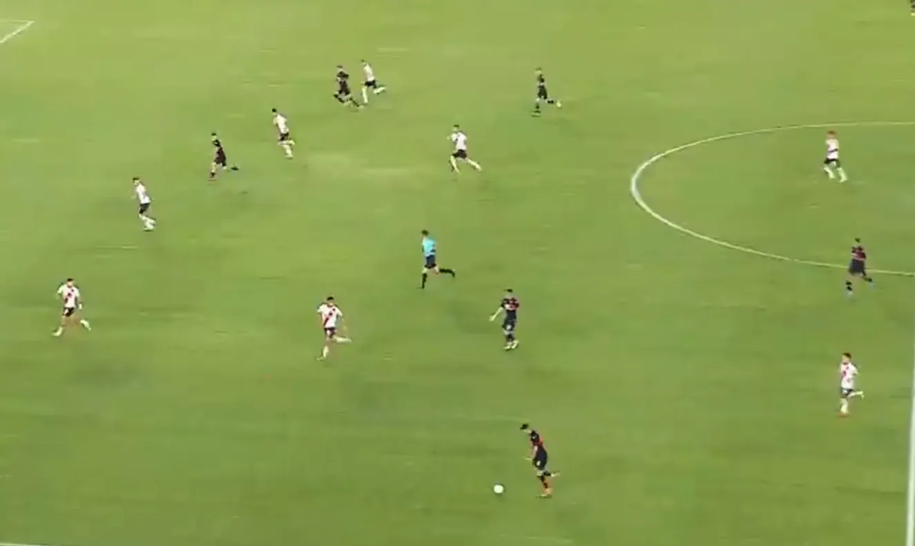 En el inicio de la jugada hubo una mala descarga de Juanfer que dio lugar a la contra del Matador. Tras la recuperación de la visita, River quedó mal parado defensivamente, con muchos jugadores pasando la línea de la pelota. Es así como, luego de que Russo dejara en el camino a Rivero, Martínez Quarta quedó solo como último hombre.