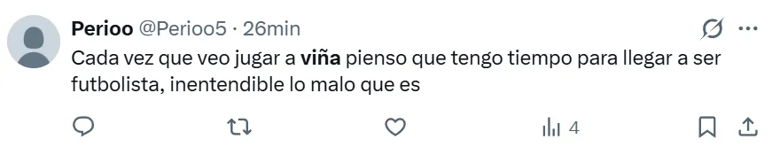 Incluso, sus primeros rendimientos en River no fueron malos. En esos amistosos de pretemporada mostró algunas cualidades interesantes, que podían potenciarse una vez que Viña esté en óptimas condiciones físicas. Pero lo cierto es que sus actuaciones en el Torneo Apertura vienen siendo pésimas y en Liniers volvió a jugar muy mal.