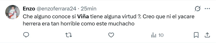 River perdió 0-1 con Vélezen el estadio José Amalfitani por la fecha 6 del Torneo Apertura 2026, profundizando así su ya extensa crisis futbolística. En una noche donde pocas individualidades se salvaron, uno de los peores jugadores del equipo volvió a ser Matías Viña y los hinchas lo liquidaron.