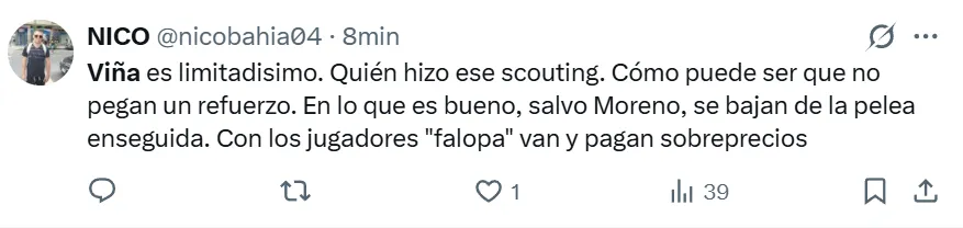 “Actuación terrorífica, tanto en ataque como en defensa. Cada pase hacia adelante terminó en la línea de fondo o en un jugador de Vélez. En defensa tuvo serios problemas para marcar a García y lo desbordaron muy fácil durante toda la noche. Despejes defectuosos, casi siempre hacia el medio, y controles largos. Ni siquiera supo poner el cuerpo para no quedar fuera de jugada en cada pelota dividida. Blandito y desordenado. Un desastre”, la síntesis de su partido en los puntajes de LPM.