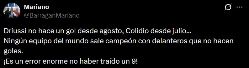 Ante los bajos niveles de Colidio y Driussi, en conferencia de prensa Gallardo fue consultado por esta cuestión y fue claro al mencionar que por el momento no está en los planes buscar a otro delantero, más allá del rumor de Rafael Santos Borré: “Entiendo esta cosa de que hay que traer, pero no es traer por traer, dentro de eso intento ser cauto y ver evoluciones en los chicos, que es lo que nos pueden dar en la competencia por los puntos para tener un recambio que nos dé frescura“.