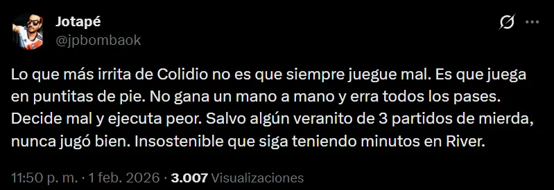 El partido de River frente a Rosario Central, que terminó en empate 0 a 0, tiene una doble lectura por lo hecho de manera positiva durante el primer tiempo y lo que sucedió en el complemento. Marcelo Gallardo se fue de la ciudad santafesina con jugadores aprobados, pero otros, como Facundo Colidio, sigue por debajo de su nivel y los hinchas manifestaron su pensamiento.
