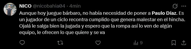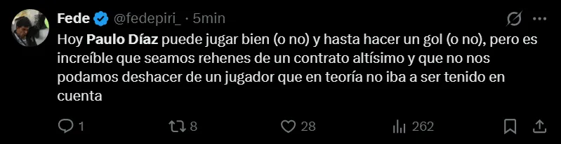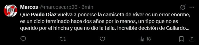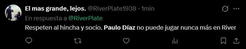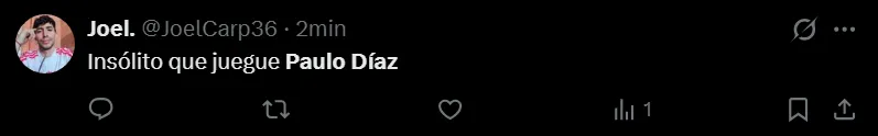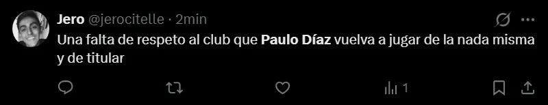 River enfrentará a Rosario Central esta noche desde las 21:30 horas en el Gigante de Arroyito en uno de los partidos más trascendentales de la tercera fecha del Torneo Apertura. Será la primera gran prueba del equipo en el año y Marcelo Gallardo tomó una decisión que no cayó del todo bien en los hinchas al darle nuevamente la titularidad a Paulo Díaz. Acá, algunos de los mensajes en las redes sociales.