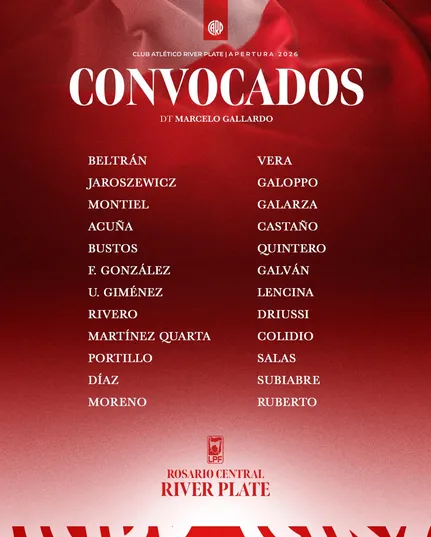 River comenzó el Torneo Apertura 2026 con el pie derecho y este domingo buscará conseguir su tercer triunfo al hilo. Después de vencer a Barracas Central como visitante y Gimnasia en el Monumental, el equipo de Marcelo Gallardo volverá a salir de su casa para enfrentar a Rosario Central. A falta de un día para el partido, el DT definió la lista de convocados.