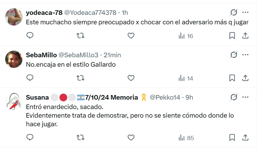 Incluso, el correntino entró en otra sintonía al partido. Frustrado por el poco contacto con la pelota y por dedicarse más a correr y marcar que a jugar, se lo vio más predispuesto a pelearse y cometer faltas que a otra cosa. Y su bajo rendimiento empieza a colmar la paciencia de los hinchas. Aunque Marcelo Gallardo lo respaldó y se mostró optimista.