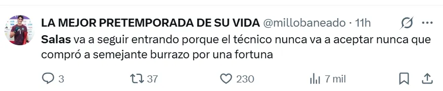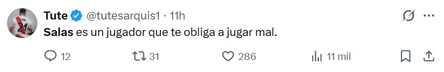 “A Salas lo pongo de delantero. Nosotros no solemos jugar con un 9 de referencia. Es normal que se hable cuando no hacen goles los delanteros, pero esroy tranquilo porque veo evolución. Ya van a convertir”, dijo el Muñeco en conferencia de prensa.