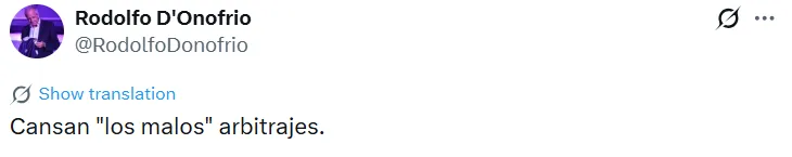 Con un marcado perfil localista, el juez cobró la mayoría de las divididas, y de las también llamadas “chiquitas”, en favor del conjunto de Nicolás Diez. Esta actuación fastidió a muchos hinchas de River, entre ellos a Rodolfo D’onofrio, quien a través de su cuenta de X (ex Twitter) publicó un duro mensaje contra Merlos y los arbitrajes en contra del Millonario. “Cansan ‘los malos’ arbitrajes”, escribió el ex presidente de la institución (2013-2021).