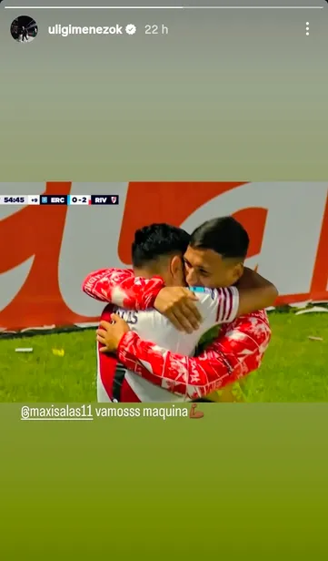 Después del triunfo, el joven defensor compartió una imagen del momento del abrazo en sus redes sociales y le dejó un mensaje al delantero. “Vamos máquina”, escribió el defensor en su cuenta de Instagram.