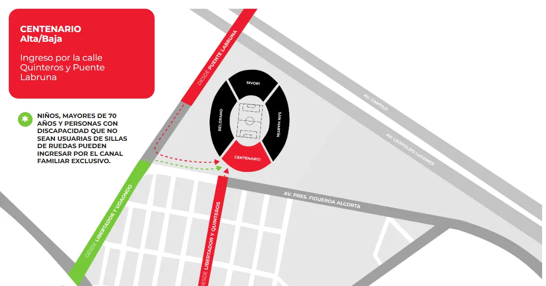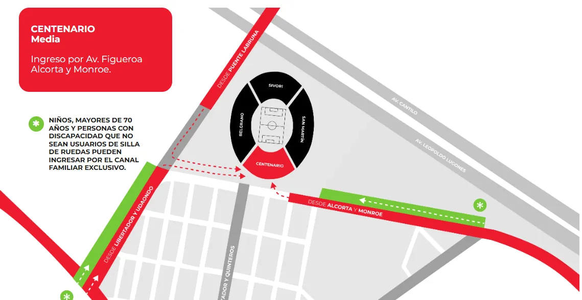 Anteriormente, los ingresos autorizados eran solamente desde el otro lado: Centenario Alta y Baja solo podían acceder mediante Avenida Libertador y Udaondo y Avenida Libertador y Quinteros, lo mismo para la media, a la que también se puede ingresar por Alcorta y Monroe. A todos estos ingresos, se le suma la alternativa para hacerlo desde Puente Labruna para quienes lleguen a la cancha desde ese costado.