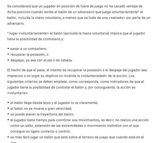 “Se considerará que un jugador en posición en fuera de juego no ha sacado ventaja de dicha posición cuando reciba el balón de un adversario que juega voluntariamente el balón, con la excepción de una salvada por parte del adversario”. Además, se establece como salvada “una acción de un jugador cuyo fin es detener o desviar el balón, o intentarlo, cuando éste va en dirección a la portería o cerca de ella”.