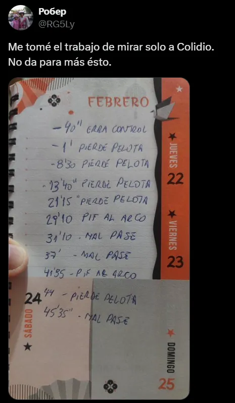 Finalizado el primer tiempo, el usuario @RG5Ly compartió un papel en el que anotó cada una de las intervenciones de Colidio con pelota durante esa etapa inicial en el José Amalfitani. “Me tomé el trabajo de mirar solo a Colidio. No da para más ésto“, escribió en el posteo.