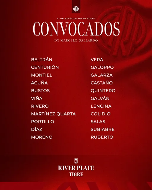 Con todo ello en cuenta, la formación que pondría Gallardo para enfrentar a Tigre sería: Santiago Beltrán; Gonzalo Montiel, Lucas Martínez Quarta, Lautaro Rivero, Matías Viña; Aníbal Moreno, Fausto Vera, Tomás Galván; Juan Fernando Quintero; Maximiliano Salas y Facundo Colidio.