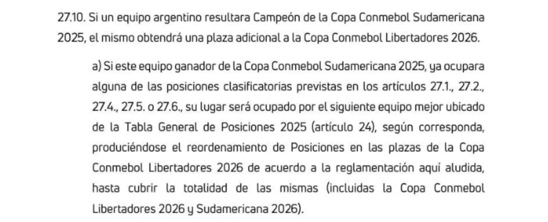 “Si un equipo argentino resultara campeón de la Copa Conmebol Sudamericana 2025, el mismo obtendrá una plaza adicional a la Copa Conmebol Libertadores 2026”, dice el artículo 27.9 del reglamento de torneos de la Liga Profesional. Por su parte, el inciso a) es el que aclara cómo se distribuirán los cupos en caso de que se repita el campeón, en este caso en el Clausura.
