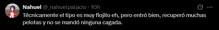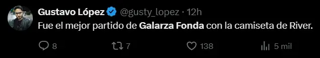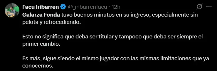 Generalmente, los comentarios para Galarza Fonda suelen ser negativos, ya que desde que llegó no logró demostrar las cualidades que el entrenador fue a buscar y no había dejado buenas actuaciones. Esta vez fue diferente, consagrando su mejor partido desde que viste el manto sagrado y teniendo participación en el segundo gol de Maxi Meza. Opiniones positivas, aunque debe seguir demostrando.