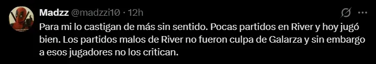 River sacó adelante un partido que se presentó indescifrable ante Talleres y logró el esperado triunfo para cortar su mala racha en el Torneo Clausura. Otro de los aspectos positivos fueron los cambios de Marcelo Gallardo, quien en el segundo tiempo mandó a la cancha a Matías Galarza Fonda y tuvo un rendimiento que fue destacado por los hinchas en las redes sociales.
