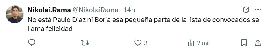 Después de jugar el Superclásico, ambos fueron borrados ante Vélez por “decisión técnica“, según explicó MG en conferencia de prensa, y nuevamente no fueron incluidos en la convocatoria ante Racing. Hace rato que era ciclo cumplido y los dos se irán en diciembre: Borja libre y Paulo Díaz espera ofertas para ser vendido. Así reaccionaron los hinchas a sus ausencias.