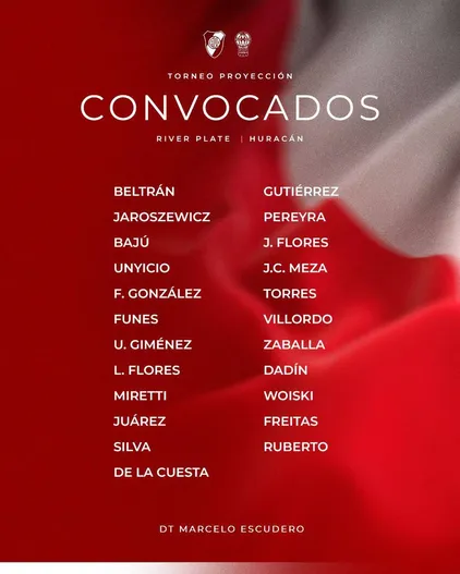 A diferencia de ellos, Agustín Ruberto, Bautista Dadín, Joaquín Freitas, Juan Cruz Meza, Agustín De la Cuesta, Facundo González y Ulises Giménez sí están convocados en Reserva para enfrentar a Huracán. De todas formas, esto no significan que no puedan estar ante Racing, sino que Gallardo también podría incluir a cualquiera de ellos en la convocatoria para el lunes.
