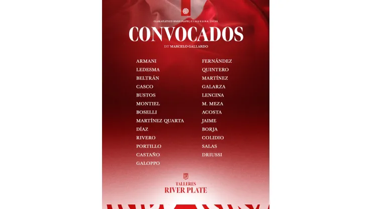 Vuelven a estar convocados Montiel, Rivero, Castaño, Juanfer Quintero, Galarza Fonda, Portillo, Santiago Beltrán, Pity Martínez y Ledesma. Estos dos últimos vienen de recibir el alta médica. También se mantienen Acosta y Jaime. Salieron, con respecto a Sarmiento, De la Cuesta, Dadín y los juveniles Jaroszewics, Obregón y Bajú.